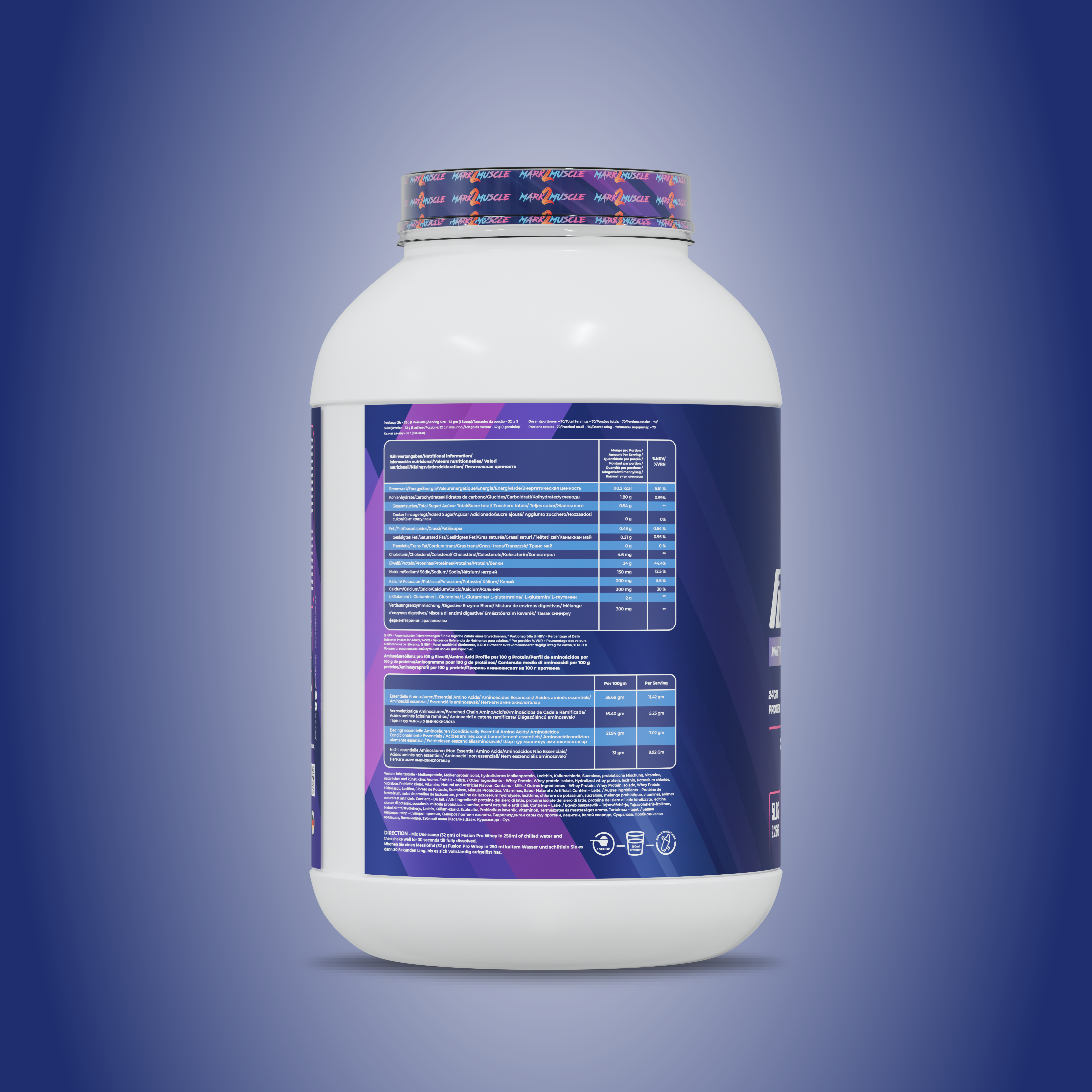 Fusion Pro ist ein Premium-Molkenproteinkonzentrat zur Unterstützung des Muskelwachstums, der Regeneration und der allgemeinen Gesundheit. Fusion Pro Whey Concentrate von Mark 2 Muscle bietet eine Premiummischung aus hochwertigem Protein. Mark 2 Muscle zeichnet sich durch sein Engagement für Reinheit und Wirksamkeit bei Nahrungsergänzungsmitteln aus. Jede Portion liefert 24 Gramm hochwertiges Protein, das für die Muskelreparatur und -synthese unerlässlich ist, während 2 Gramm Glutamin dabei helfen, Muskelkater zu reduzieren und die Regeneration zu verbessern. Die Aufnahme von 5,2 Gramm verzweigtkettigen Aminosäuren (BCAAs) fördert die Muskelproteinsynthese und hilft, Muskelabbau bei intensiven Trainingseinheiten zu verhindern. Darüber hinaus sorgt die proprietäre Mischung aus Verdauungsenzymen für eine optimale Proteinaufnahme und maximiert so den Nutzen jeder Portion. Dieses wissenschaftlich formulierte Molkenprotein unterstützt nicht nur die sportliche Leistung, sondern trägt auch zu einer verbesserten Immunfunktion und dem allgemeinen Wohlbefinden bei. Erleben Sie die überlegenen Vorteile von Fusion Pro für optimale Leistung und Erholung. Fusion Pro Whey Protein Concentrate